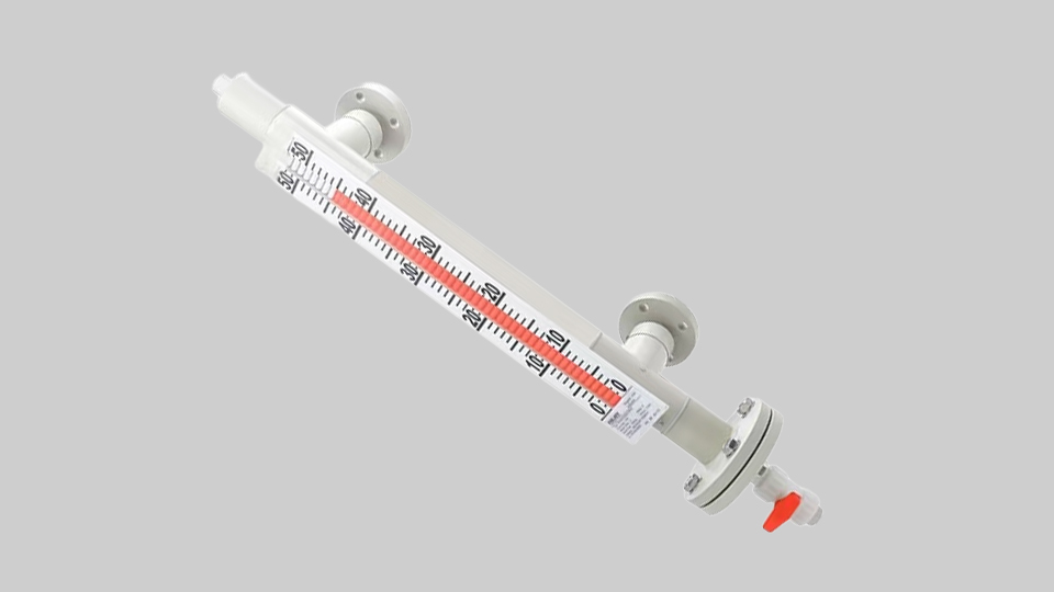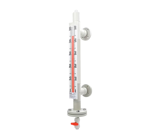 液位計根據浮力原理,浮子在測量管內隨液位的升降而上下移動,浮子內的永久磁鋼通過磁合作用,驅動紅、白色翻柱翻轉180液位上升時,翻柱由白色轉為紅色,下降時,翻柱由紅色轉為白色,從而實現液位的指示。