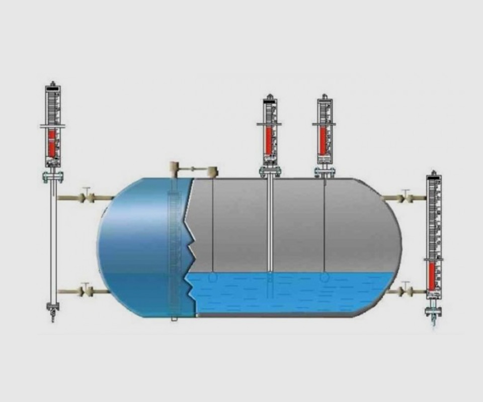 磁翻板液位計(也可稱為磁性浮子液位計)根據浮力原理和磁性耦合作用研制而成。當被測容器中的液位升降時,液位計本體管中的磁性浮子也隨之升降,浮子內的永久磁鋼通過磁耦合傳遞到磁翻柱指示器,驅動紅、白翻柱翻轉180°,當液位上升時翻柱由白色轉變為紅色,當液位下降時翻柱由紅色轉變為白色,指示器的紅白交界處為容器內部液位的實際高度,從而實現液位清晰的指示。